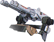 The electromagnetic cannons are equipped to the back, with their mount locking into the mechanisms that allow the Bear Fighter to change its stance. The guns can rotate up and down at the cap, able to point almost straight into the air.