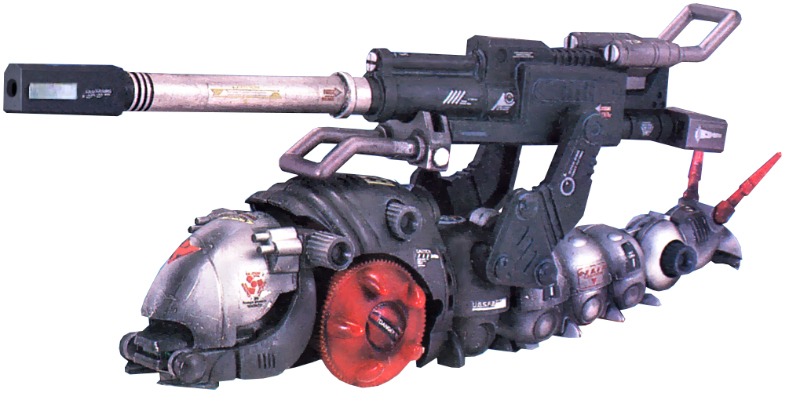 The Molga's low posture and thick armor helps it survive enemy gunfire, but when situations turn sour, its true feature is the double-armored cockpit. With a helmet that goes over the actual clam-shell cockpit design, the Molga's head boasts armor twice as thick as the rest of its body. This allows the Molga to charge head-long into battle, while also giving it an amazing survival rate. Even if the Zoid is brought down, the pilot has a high chance of surviving the fight.