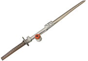 This long-handled ninja sword is Tobizaru's primary weapon. Though its been painted black, the shine of Metal-Zi can't be hidden, so it glints in the moonlight even as the Zoid tries to hide. (Yes I know this image is decidedly not black- It was said to be black in the story text, but the custom model kit differs on some details.)
