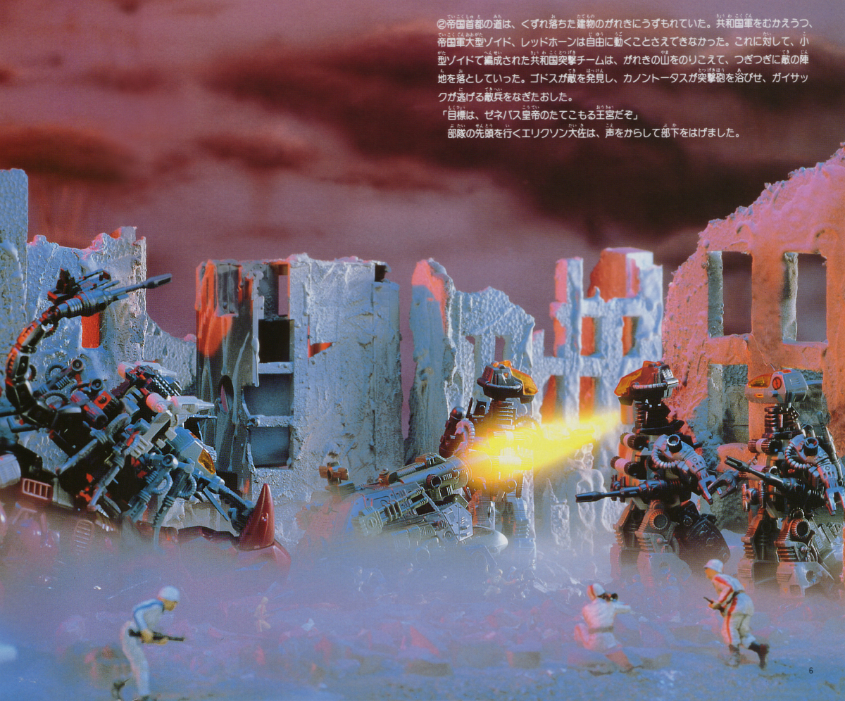 The roads of the Imperial capital were buried under the rubble of collapsed buildings. The large Imperial Zoid facing the Republican forces, the Redhorn, was unable to move. In response, the Republic Assault Team, composed of smaller Zoids, climbed over the piles of rubble and took down enemy positions one after another. The Godos were used to spot the enemy while Cannontortoises fired their assaults and Guysacks mowed down fleeing enemy soldiers.