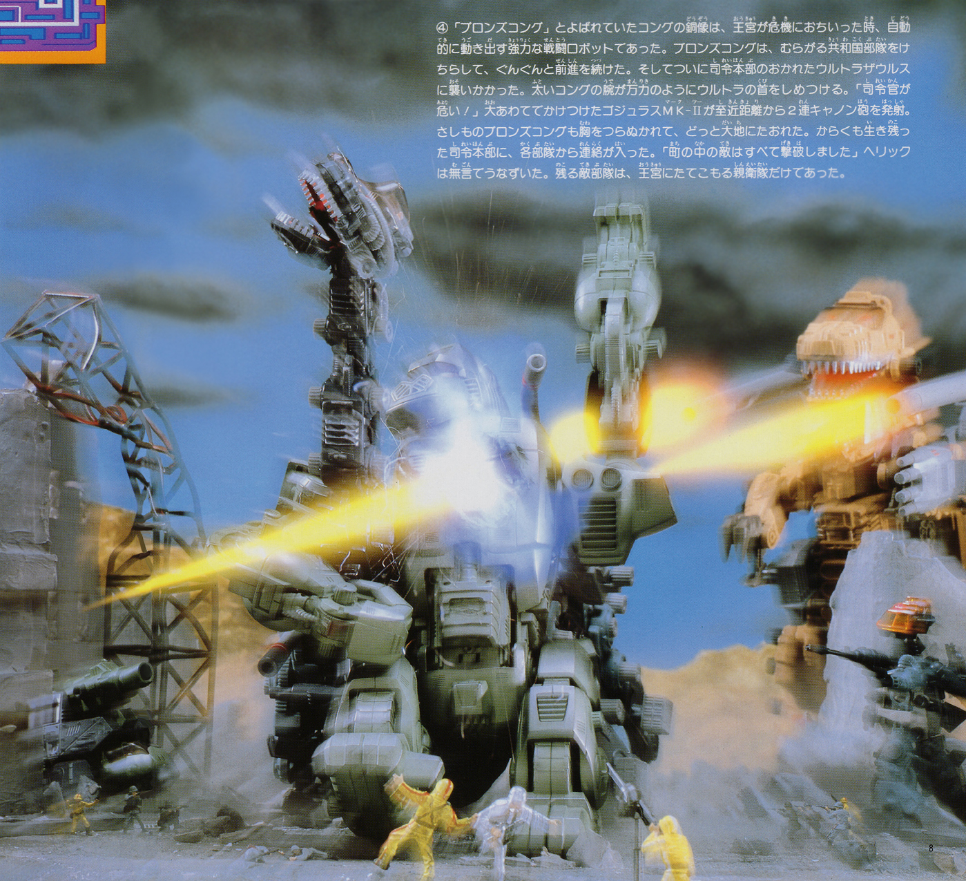 The Gojulas MK-II, rushing to the scene, fired its 2-barrelled cannons at close range. Even the Bronze Kong was pierced through the chest and crashed to the ground. Each unit contacted the command center, which had just barely survived.