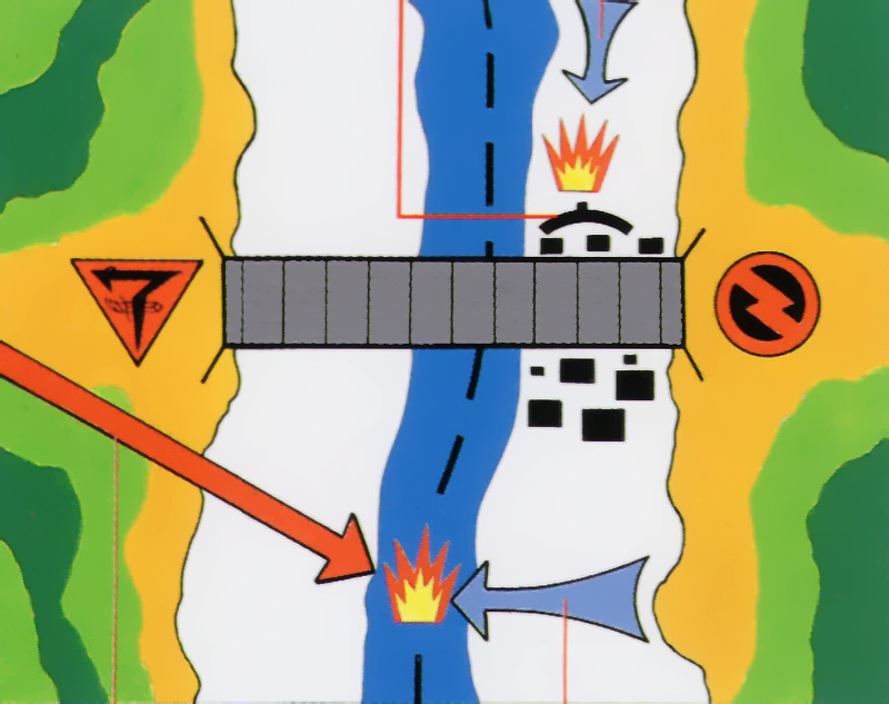 The surprise attack was successful, and the bridge fell into the hands of the Iguan forces. Lt. Col. Frost, commander of the airborne forces who was piloting a red Iguan positioned his subordinates on both sides of the bridge.
