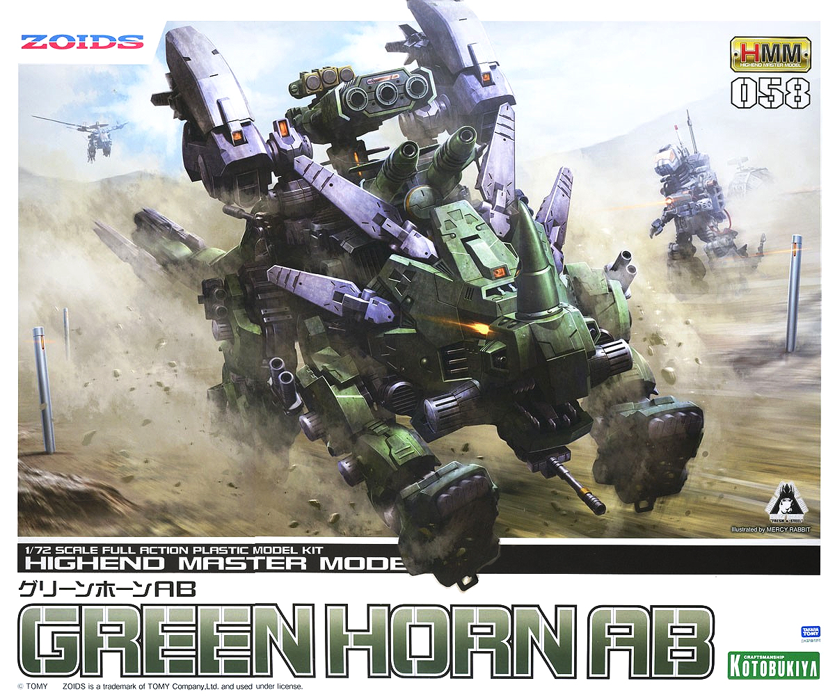 - The Green Horn AB had several concepts for its box art. The first would've depicted it actively using the experimental particle shields. The second would've shown off the fact that in spite of all of its equipment, this Zoid is actually only slightly heavier than the Shield Liger! And would've had it fleeing across a suspension bridge. The third and final example reimagines its escape scene, but while it technically didn't have the ABs in this scene, they elected to keep them to match the Kotobukiya interpretation.