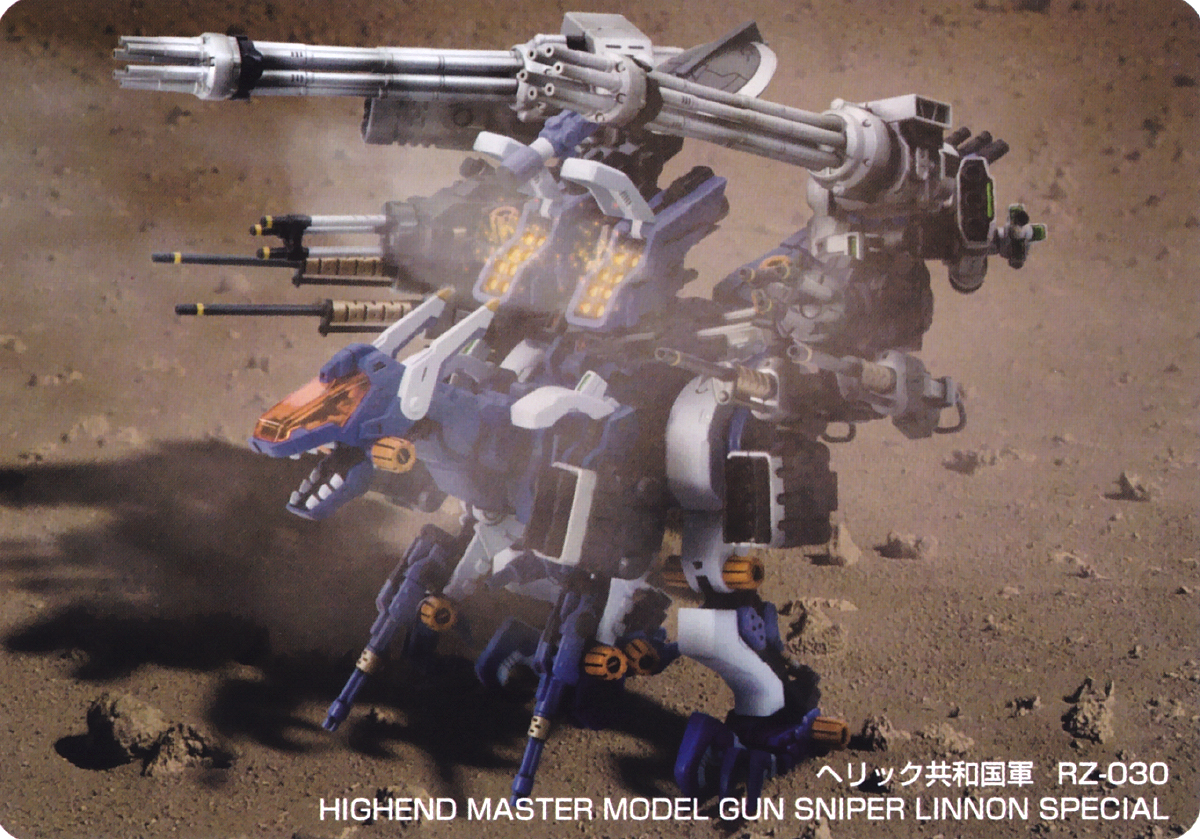 Its biggest feature is the heavy fire power armaments, the highest in class of the HMM series so far! The Gatling Gun & Anti-Zoid 3-Barrel Cannon are newly created parts, made to fit the size of the Gun Sniper. In addition, you can enjoy all of this equipment, which could be called a "moving arsenal", with missiles and such equipped to each part.