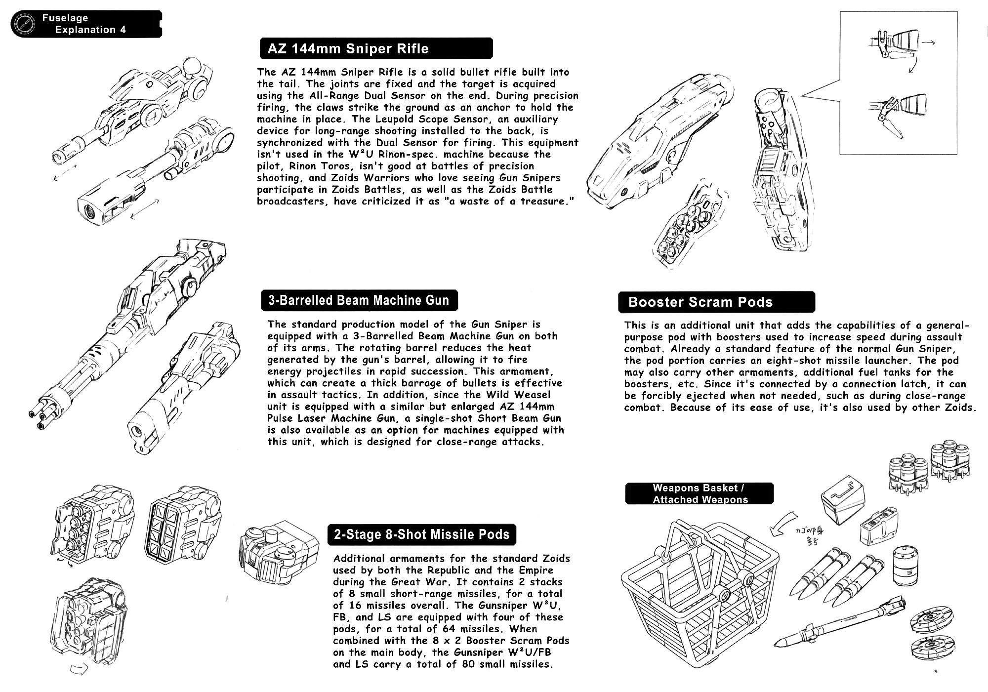 A Gun Sniper variant equipped with maximum firepower, said to have been used by certain special forces in the Helic Republic Army during the Central Continent War. By making the most of its Octo Weapon System, the weapon extension function of the Wild Weasel Unit (W2U), which was developed as dedicated additional equipment, it was able to be equipped with 4 2-Step 8-Shot Missile Pods, which were additional armaments made by the Republican Army, as well as 2 6-Barrelled Beam Gatling Guns (Mid-Sized) and 2 Anti-Zoid 3-Barrelled Linear Cannons, which were armaments captured from the Guylos Empire Army. All of this in addition to the W2U's standard weaponry, the 2 AZ 144mm Pulse Laser Gatling Guns and 4 AZ 180mm 2-Barrelled Beam Guns. Its main body was also given a reinforcing tune-up, focused on the body frame and leg joints, in order to hold this overloaded equipment. With this, we've succeeded in giving the small-scale Zoid Gun Sniper firepower superior to a medium-scale Zoid. But although this machine could be called a "running armory", it has poor operability, so it was a special mission Zoid used only by a handful of excellent Zoid pilots and depending on the strategic situation.