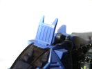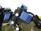The back gun is very posable, much like the original~ The base arm of the gun flips upwards and the gun is attached on a peg that allows it to rotate 360. The gun can be aimed while the blue panel above it is laid flat. It can sometimes be hard to get the gun out when it's fully folded back down, though.