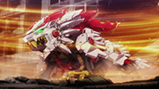 A legendary lion type Zoid with red and white armor.