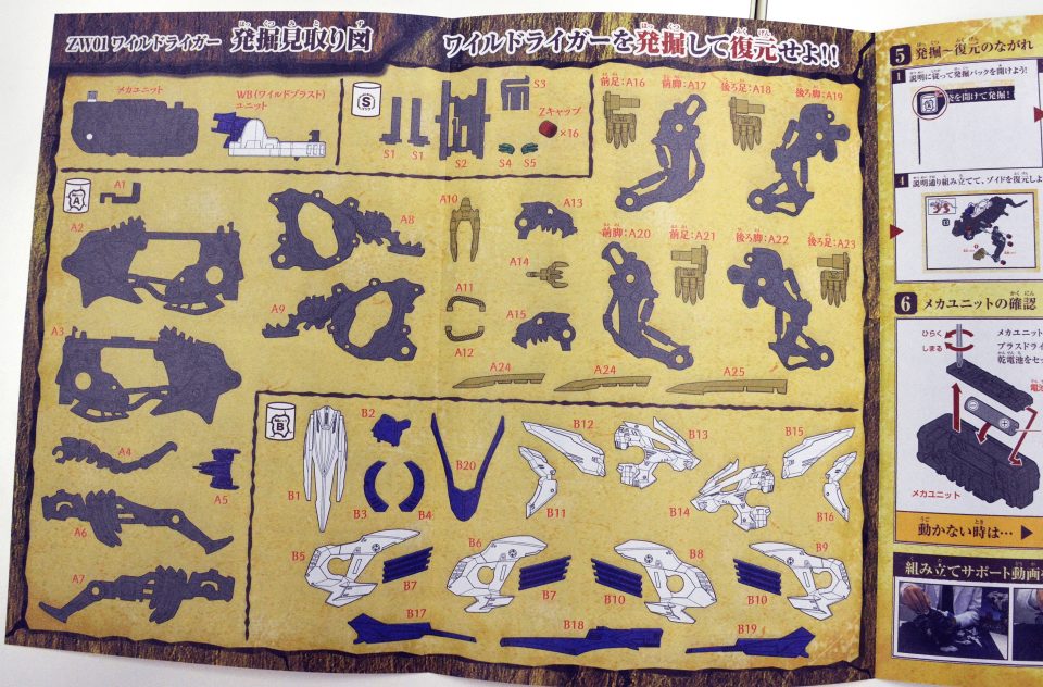That's whythe Zoids Wild kits already start off with the parts removed, and placed loose in a bag. The bag in which the parts are placed is a proper bag like those used while excavating ruins, and I imagined the excavated parts being carefully stored in such bags. The partitions were designed to resemble geological strata, and the instruction manuals were called the Book of Restoration, to evoke the image of an excavation site still covered in soil. This is where the younger generation did their best.