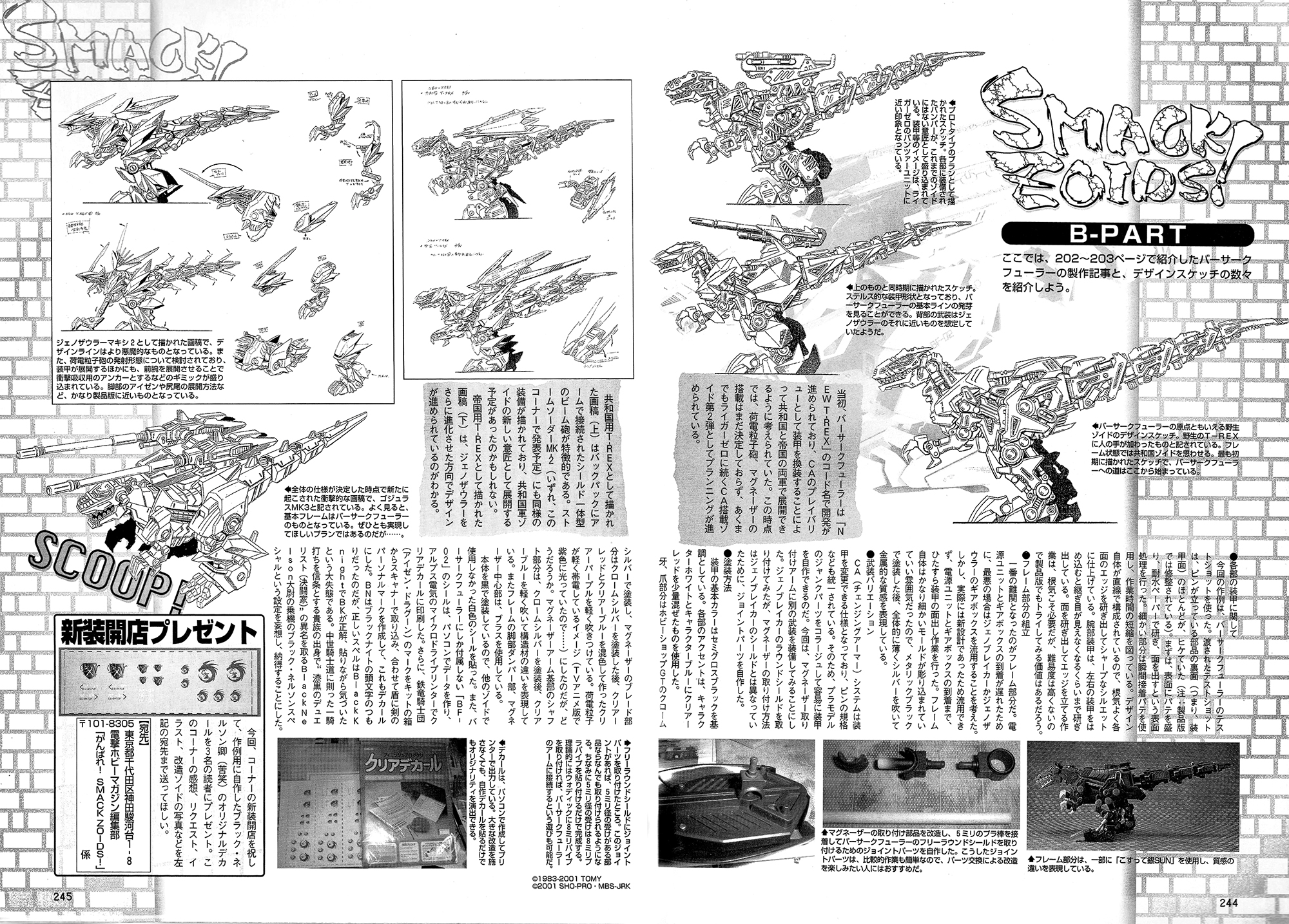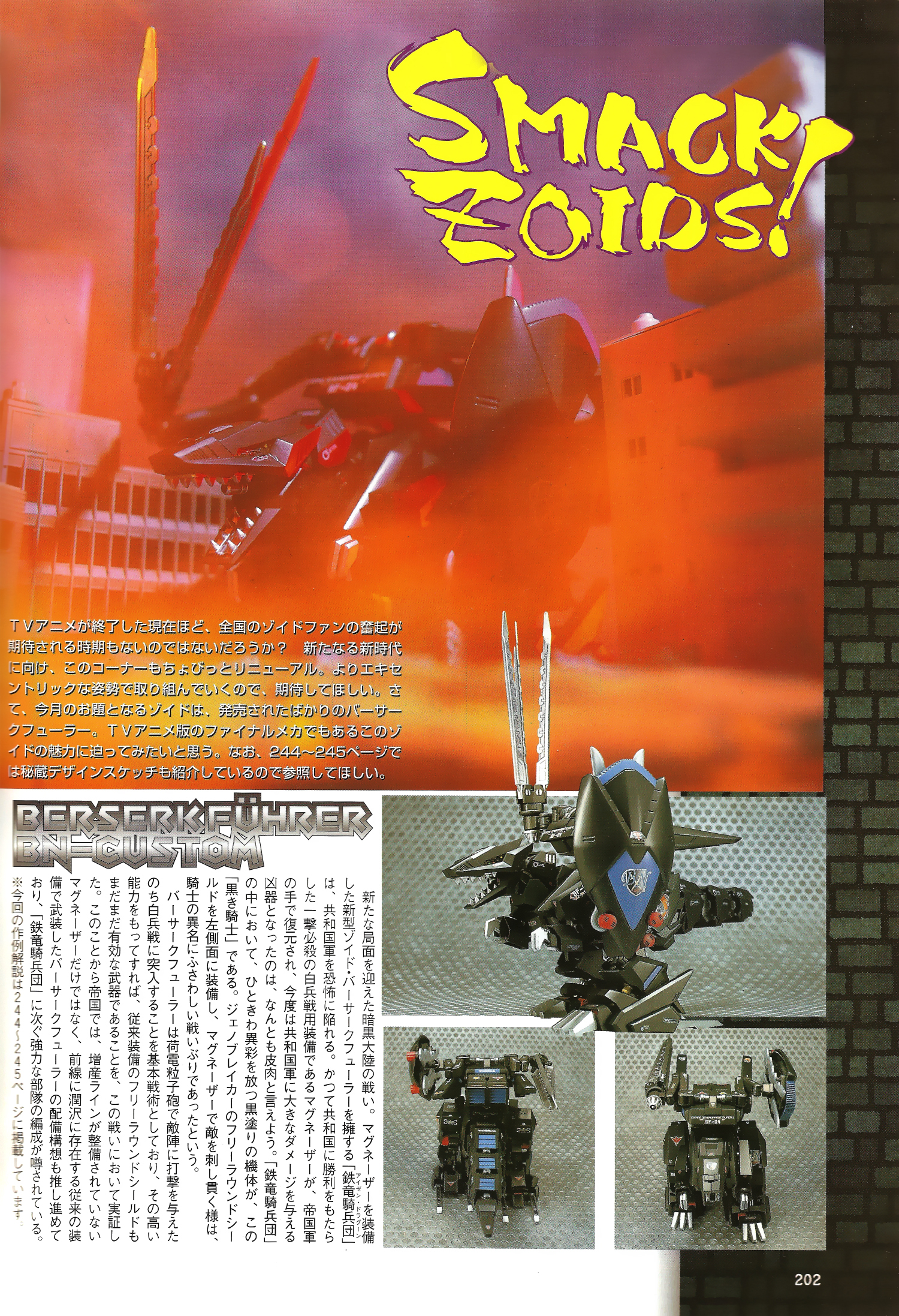 Now that the TV anime has concluded, there's never been a better time to expect Zoids fans all over the country to be inspired. This corner has been slightly renewed for the new era. We'll be taking a more eccentric approach, so please look forward to it. Now, this months' theme Zoid is the newly-released Berserk Führer. We'd like to explore the appeal of this Zoid, which was also the final mecha in the TV anime. Please also refer to pages 244 ~ 245, where we'll introduce secret design sketches.