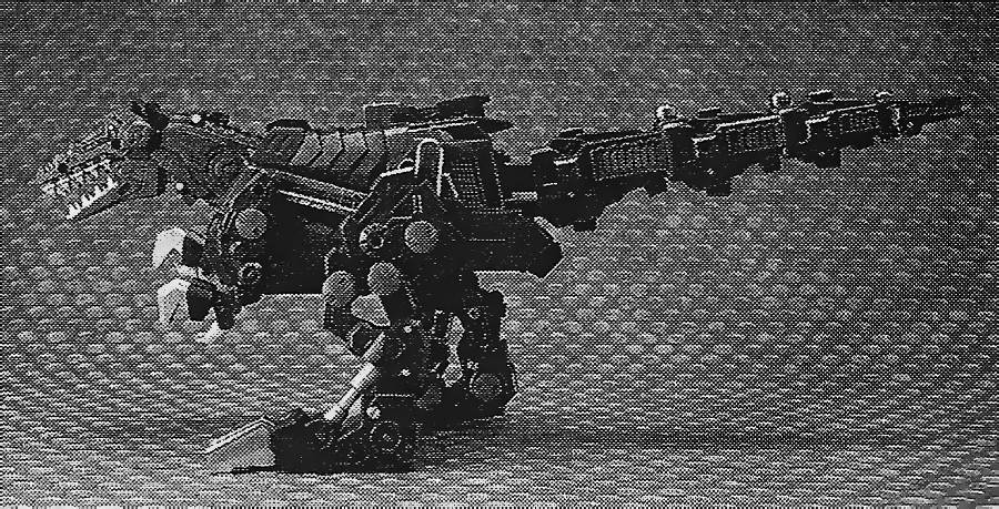 The drawing (top) of the Republican T-Rex features a Shield-Integrated Beam Cannon attached to the backpack by an arm. The same equipment is also depicted on the Storm Sworder MK-II (to be announced in this corner at somepoint), so it may have been planned to develop it as a new design for Republican Army Zoids.