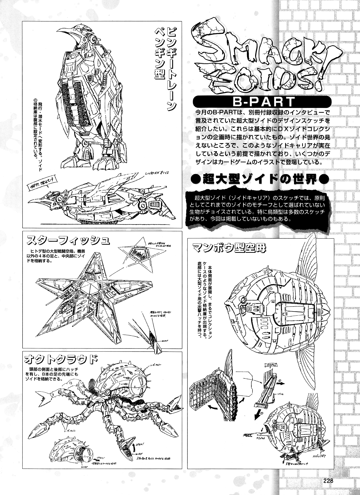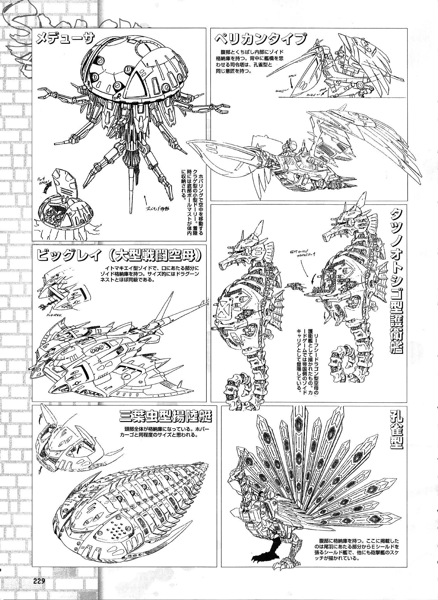 As a general rule, creatures that haven't been chosen as motifs for previous Zoids were selected for the sketches of these super-large Zoids (Zoid Carriers). In particular, there are numerous sketches of bird types, some of which were not included in this issue.