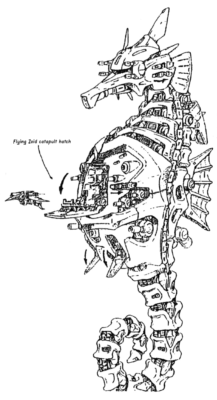 Transforms into flying/diving mode. A Zoid hangar is set in its belly.