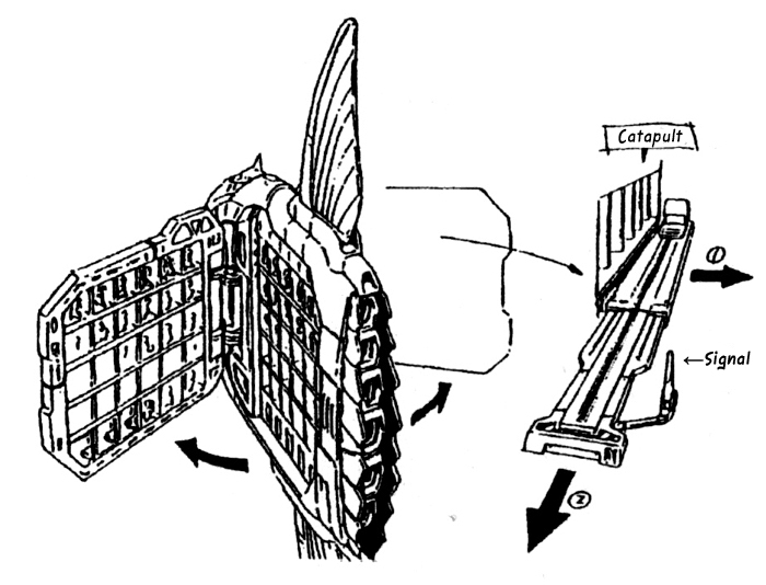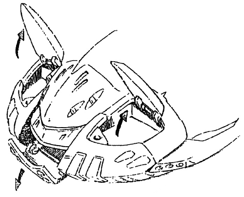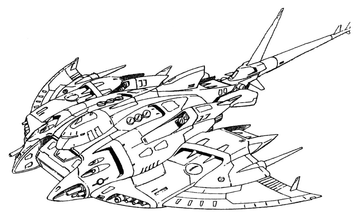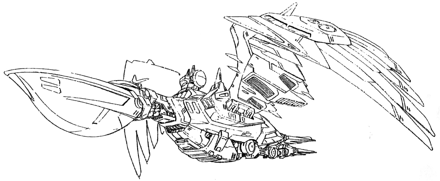 Has a hangar in its belly. The one shown here is a shield vessel that can deploy an E-Shield from its tail feather parts, but a gunship sketch was also drawn.