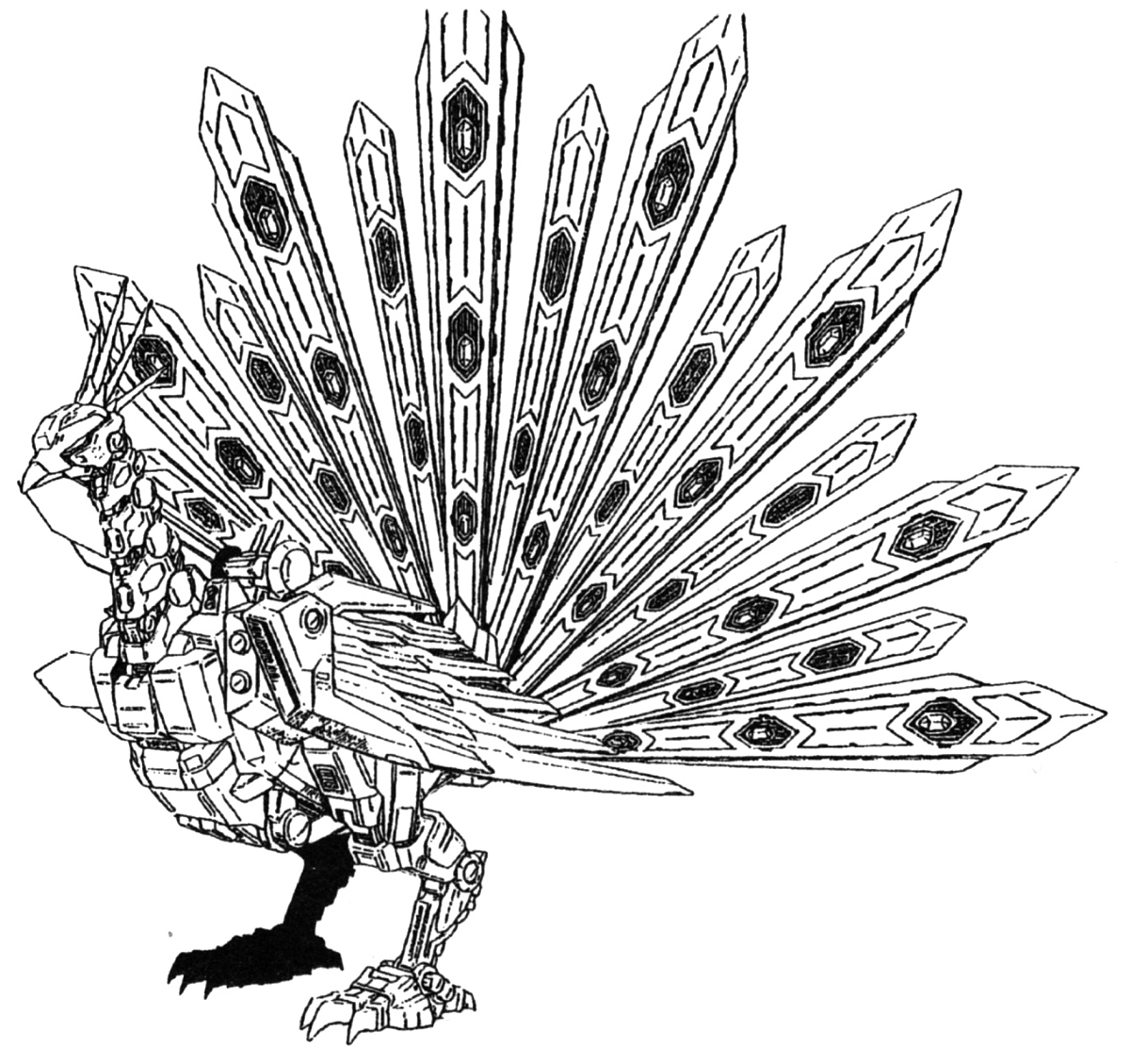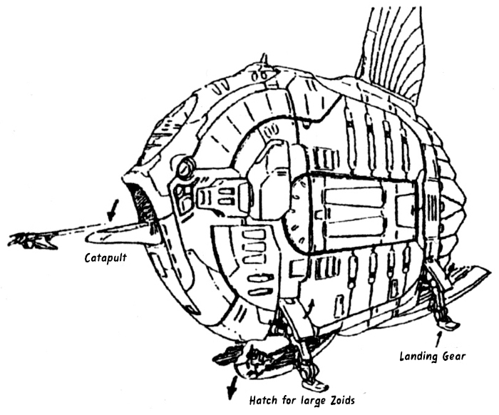Has Zoid hangars in its belly and inside its bill. The bridge-like control tower on its back has the same design as the peacock-type.