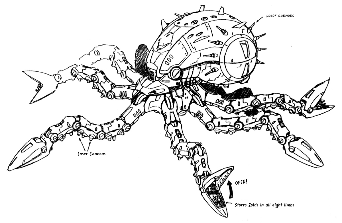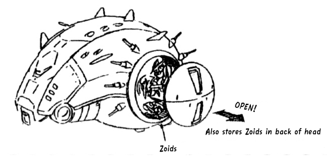Has hatches in the sides and back of its head, and can also store Zoids in the tips of its eight limbs.