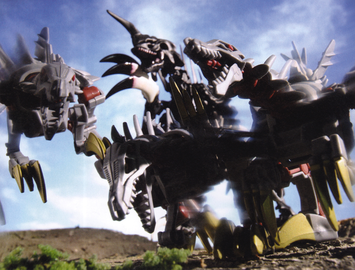 On a stormy day a swarm of Bio Raptors fled a much larger Bio, the Bio Spino. As they ran they moved through a graveyard of their brethren, ensuring there was no confusion about them being prey. On the way out, however, civilian Zoids appeared in the path. The Bio Raptors fought viciously to get past them, and many of them did. Those who got held up were immobilized by the electromagnetic waves of the Bio Spino, and were slaughtered one by one until the Jin Squad managed to get close enough to attack the Spino.