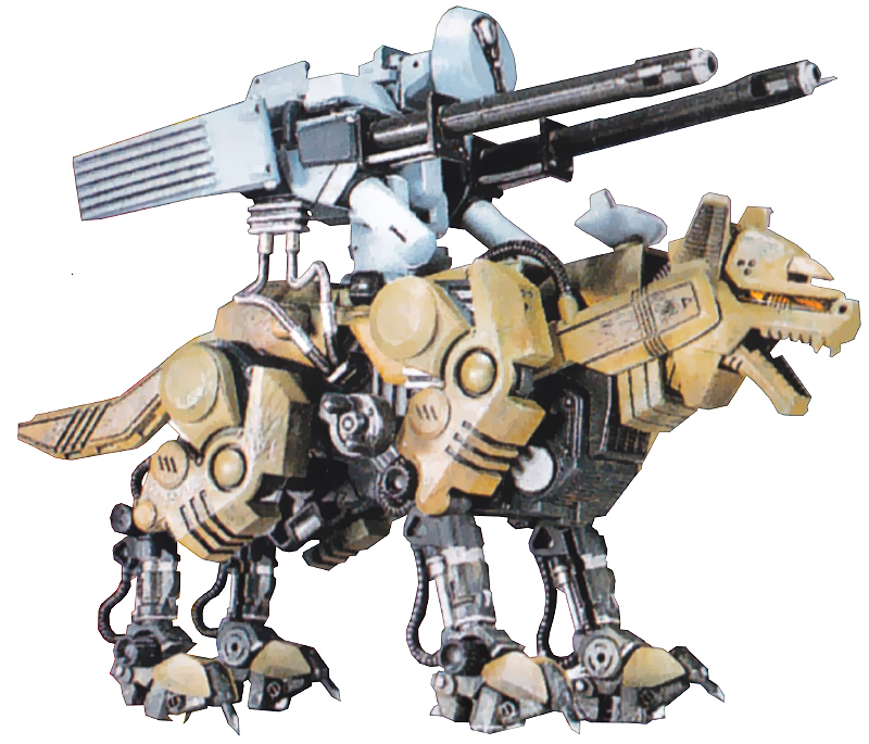 Also referred to as the Double Laser in Zoids Legacy, this weapon replaces the standard back equipment of the Command Wolf. It's made of two large guns that are wired into the port where the Smoke Dischargers are normally installed. Not much is known about it. The Climber Wolf is also noted to have Bite Fangs, but these appear to be the same as the standard Command Wolf, aside from names (which may just be a case of cutting the name short because the game had strict character limits.)  [2]
