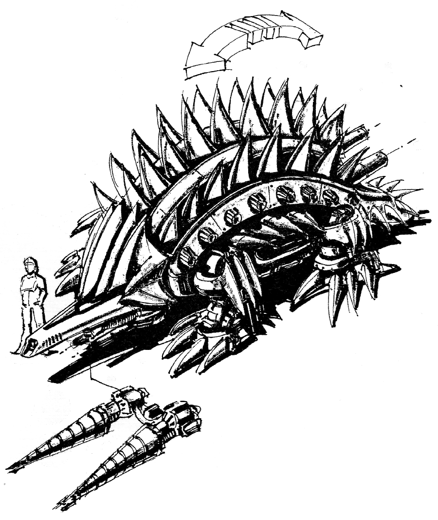 These powerful drills are attached to the legs of the Grounchar, which can fold up under its body during use, turning the drills towards the ground. By rapidly spinning the weapons it can quickly burrow underground, to a depth of about 20 meters. This is more than sufficient to protect it from enemy Zoids while still allowing it to use its jamming waves.