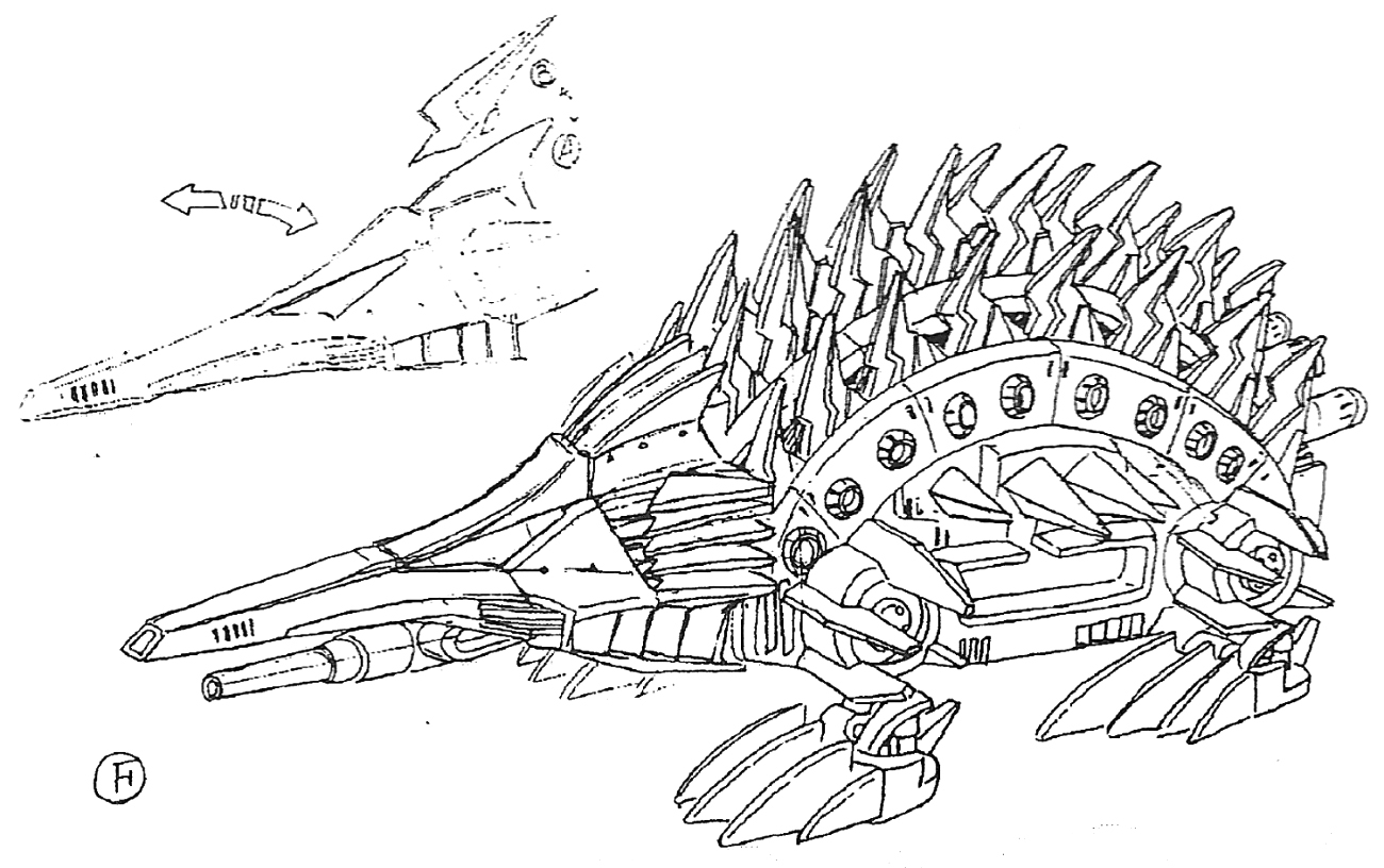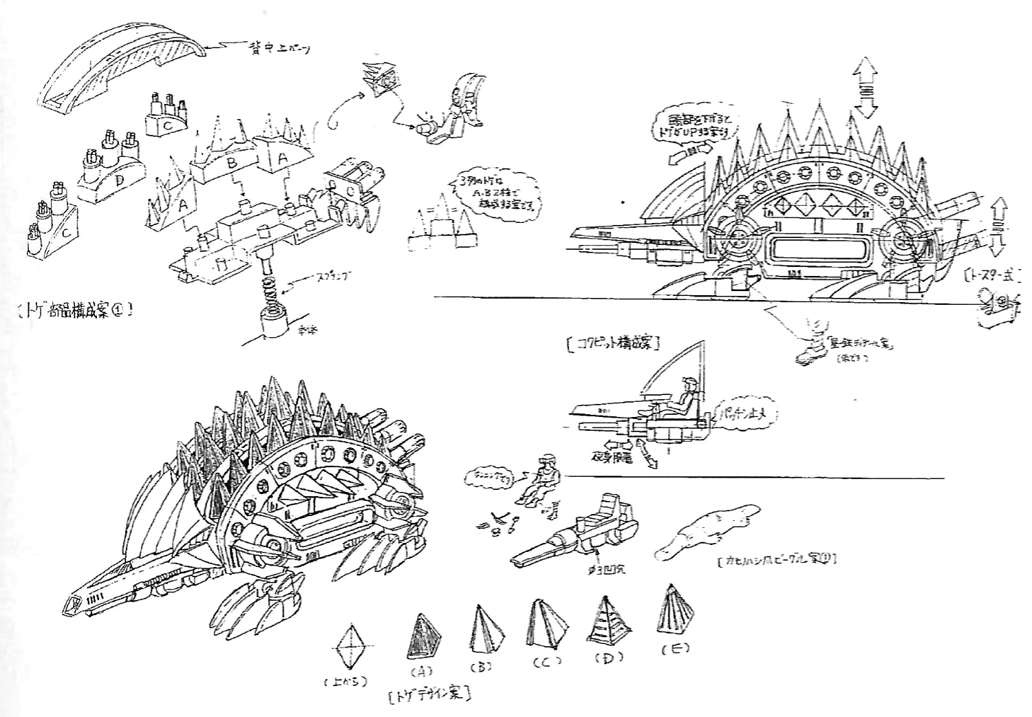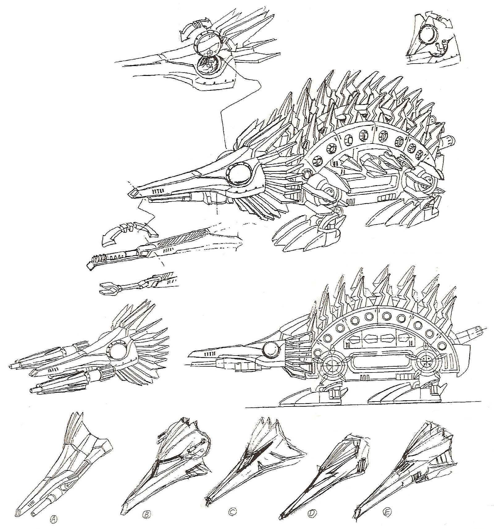 A few Grounchar concepts were featured in the October 2001 issue of Dengeki Hobby Magazine. The second concept shows some interesting ideas. The Laser Swords were at one point designed around a spring mechanism to make the swords jump up. The pilot seat also would've doubled as an independent platypus-themed vehicle (seen just above the individual diamond spike designs.) The fourth concept image also shows extendable weapons (guns or arm manipulators) that could extend from the mouth, as well as hatch eyes that could rotate up on the head, allowing the pilot to climb in and out.