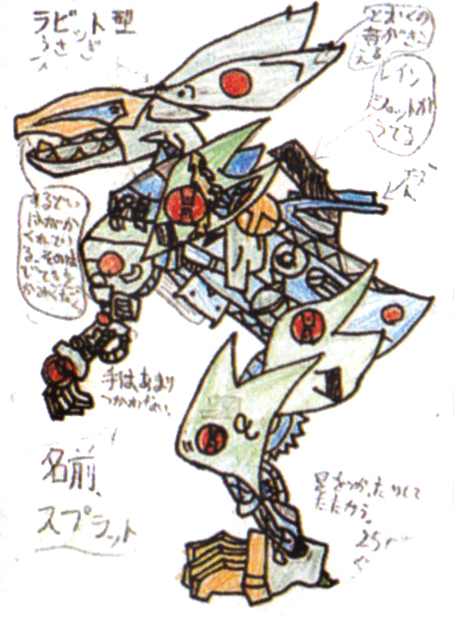 Sprat was part of a segment in CoroCoro Magazine, which attempted to create custom model kits based on modification ideas sent in by fans. This was the drawing the custom was based on, submitted by fan Tomohiko Nakazawa. The custom created from it was made by combining Diloforce and Demantis.