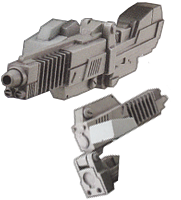 Not given a distinctive name, Tobizaru also has a generic cannon that replaces the dart gun. This weapon is depicted when Tobizaru is fused with Eika, though there's nothing stating it to be explicitly tied to the transformation, as there's just not enough media depicting Tobizaru either way. That being said, the cannon's also designed to fold in the middle, allowing the front half to fold backwards over the top for a more compact form.