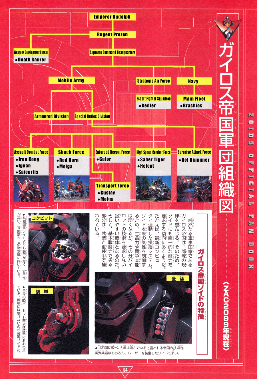 The Guylos Empire is an absolute military nation, and prizes order in its forces. Therefore, they also tend to demand uniform abilities from their Zoids. For instance, they have piloting systems linked to the latest computers. They control the Zoids' natural temperaments, so their life forces and fighting instincts are weakened, but in exchange, this makes for easy-to-handle units that do not demand skill from the pilots. Additionally, any inferiority in basic combat strength is compensated for with weaponry and heavy armour.