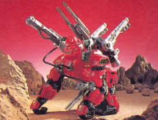 ⚫ Height: 6.5 m ⚫ Weight: 34.6 tons ⚫ Maximum Speed: 100 ~ 120 km/h ⚫ Price: 780 Yen A small-scale Zoid equipped with heavy cannons that specialised in rear support. |