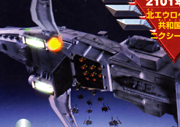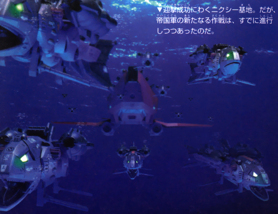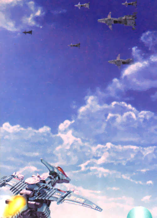 The giant pterosaur-type Zoid emerged from the hangar and soared into the sky, carrying anti-aircraft missiles used against large ships. The soldiers at the Nixie Base saw them off with praying eyes.
