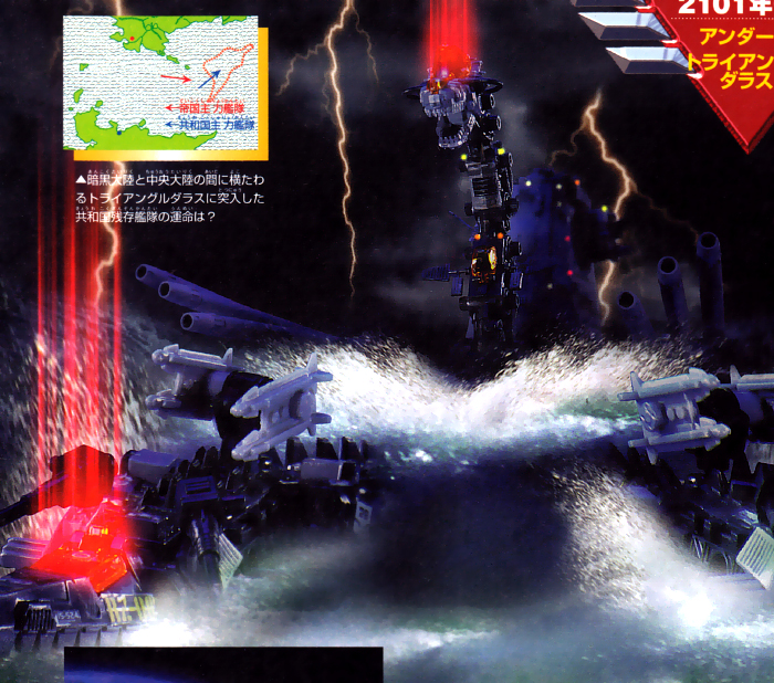 The powerful electromagnetic region of the ocean, the Triangle Daras, was a demonic sea feared for making all instruments useless and eventually bringing death to all Zoids.