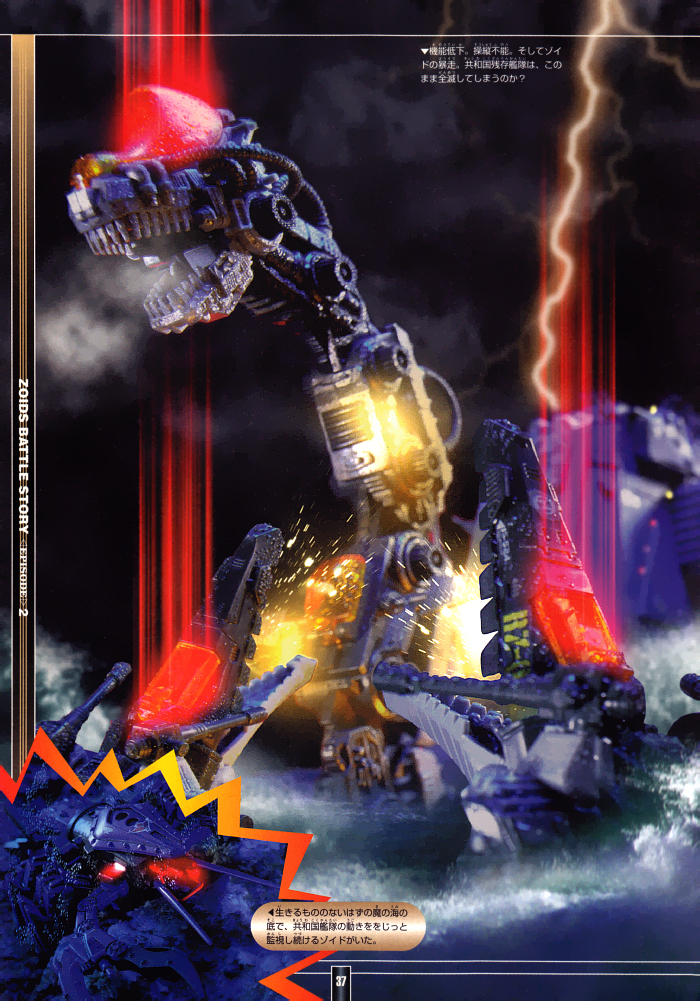 The Republic fleet was on the verge of destruction. Suddenly, a Zoid they had never seen surfaced in front of them. It was a crawfish-type Zoid. Perhaps it had some sort of defence method, because it showed no signs of being affected by this demonic sea. The Empire army insignia painted on its body was clearly visible.