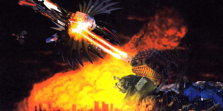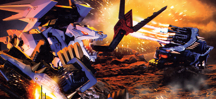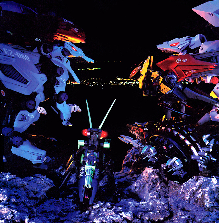 The Dark Spiner, in particular, became a target of fear among Republic soldiers. As soon as they entered the range of the Jamming Waves emitted from their dorsal fins, they'd lose control of their Zoids, which could then be manipulated at the enemy's will. Gojulas and Liger Zero, who were supposed to be their strongest allies, suddenly became their enemies. Nothing could've been more frightening. On top of that, the people of the former Zenebas territories were revolting, engaging in a series of destructive activities.