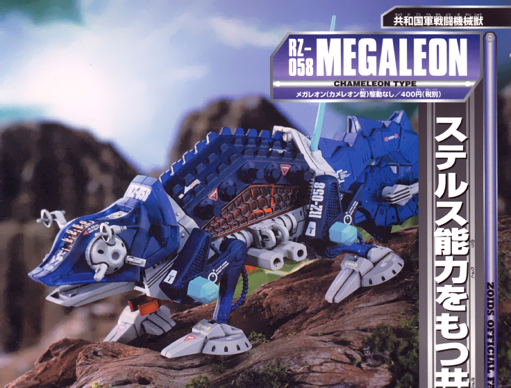 The Megaleon is the Republican Army's first super-small (SS) Zoid, developed for the defense of the Central Continent of Delpoi. Since it wasn't designed to invade enemy territories it has glaring weaknesses when it comes to mobility and maneuverability, but due to its excess power output, its enemy search abilities, shooting performance, and stealth abilities are unbelievably superior for a Zoid of this class. Its high-power optical camoufalge allows it to ambush on any terrain, while its radar and two types of scopes quickly spot enemies. It shoots right through an enemy's vital points in a single shot with the deep-penetrating Twin Energy Cannons.
