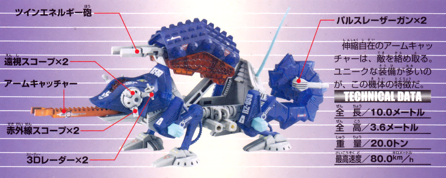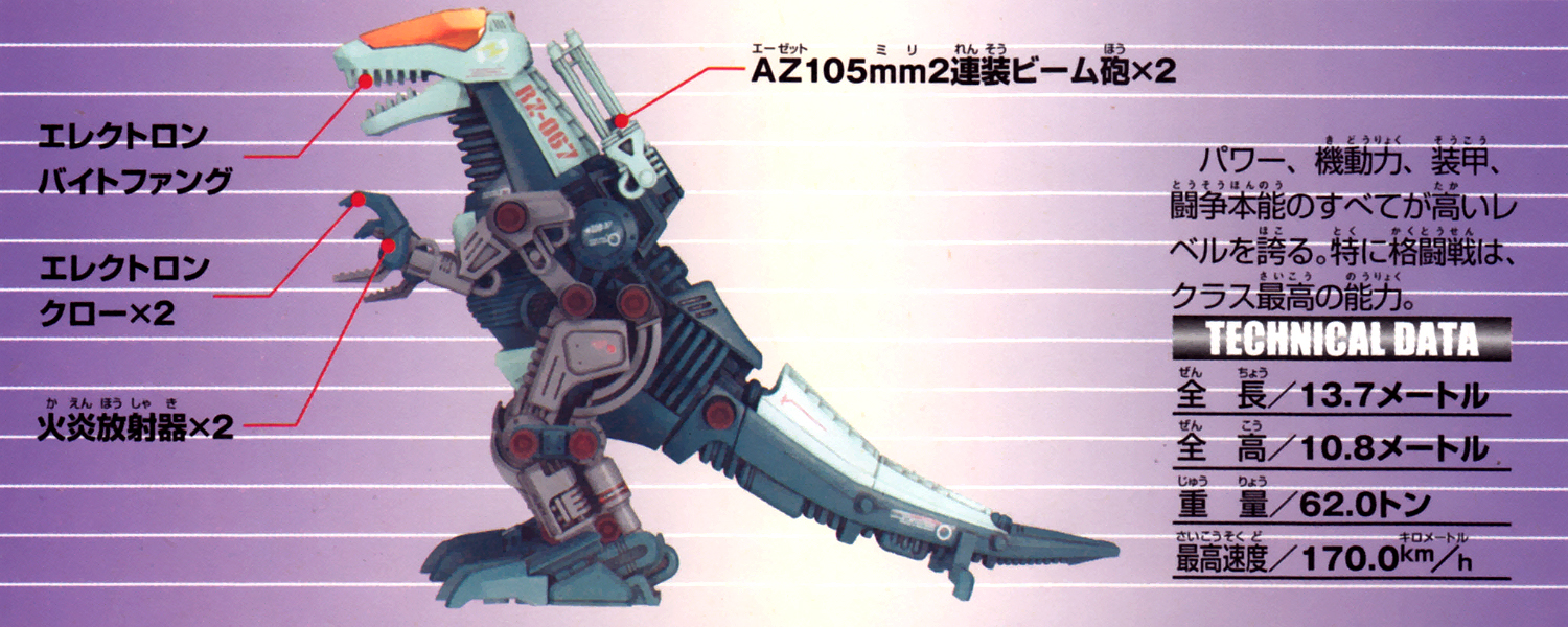 However, the leaders of the Republic, who regretted losing the fighting capabilities and versatility of the Arosaurer, planned to reproduce them by protecting their base wild Zoids and cultivating Zoid Cores. In ZAC 2106, as the fierce battle continued against Neo Zenebas, they finally returned to the front lines as support units for the Gojulas Giga.
