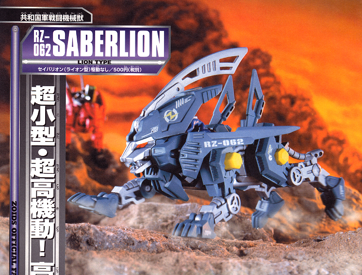 The Saberlion is the ultra-compact machine of the Republican Defense Force, developed based on the high-performance mass-production SS Zoids of the Eisen Dragoon. Compared to conventional small-scale Zoids, Saberlions are more maneuverable, and their sharp turning abilities are a huge advantage in melee combat. It was supposed to be deployed in guerrilla warfare to take advantage of these capabilities, in urban warfare, or as a support machine for high-speed divisions. However, at the time that the first model had been completed, the capital of the Republic was already on the verge of falling to the Eisen Dragoon. Eventually, the Republican Army, which had lost control of the Central Continent and wanted a lower-cost machine, shifted its main small-scale mass-production machines to BLOX. As a result, the Saberlion, despite its ample capabilities, was so rarely deployed that it was dubbed the Phantom Zoid.