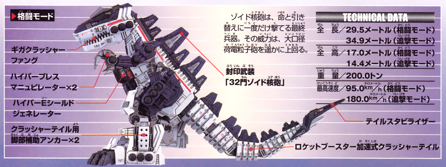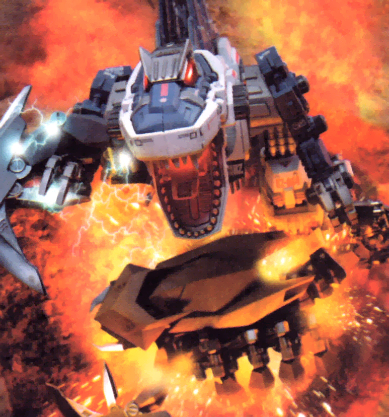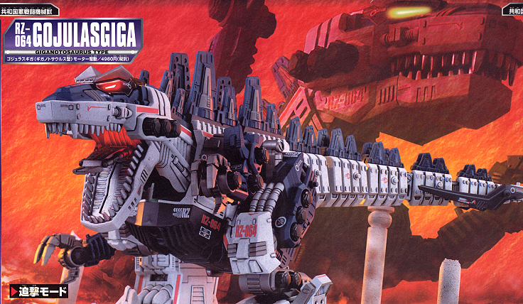 ZAC 2105, four years after the Eisen Dragoon's invasion on the Central Continent. The Republican Army, on the brink of destruction, had created a new giant Zoid based on the wild body of the rare giganotosaurus species. Gojulas Giga. By transforming from fighting mode to pursuit mode, this monstrous mech had achieved mobility that surpassed the scope of giant Zoids. This speed maximized the keen fighting abilities of the Giga's wild form, and its fighting power in close-range combat even surpassed that of the Death Saurer. By employing an ancient titanium alloy for its armor, it was also able to successfully block the Dark Spiner's jamming waves. The Giga surpassed all other Zoids in Neo Zenebas. It was a machine truly worthy of being called the trump card in the Republic's counteroffensive.
