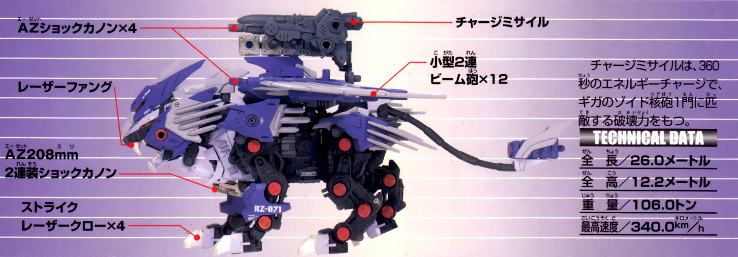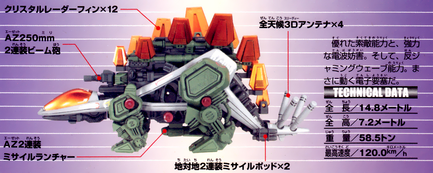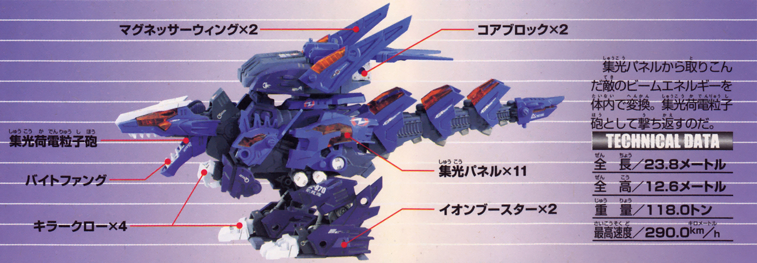 The summer of ZAC 2106. The Republican Army was soon to be driven from the Central Continent by the Seismosaurus created by Neo Zenebas. There was no way to counter the Zenebas Cannon, which fired from far beyond their enemy search range. However, one year after their defeat, the Republican Army escaped to the Eastern Continent, and with the support of the private military company, ZOITEC, and the BF Wild Body supplied to them by the Guylos Empire, they completed a Zoid that could be used against the Seismo. The Gairyuki could absorb the energy beam using its condenser panels, convert it into energy of its own, then fire it back at it. Also able to separate its armor from its main body to be used as dual wielded BLOX, Gairyuki is a next-generation Zoid that stands out from conventional technology.