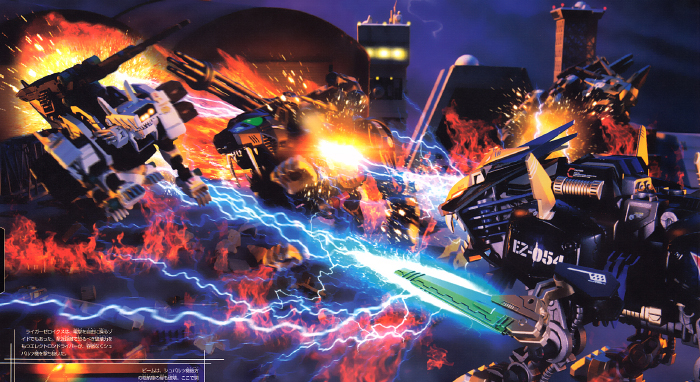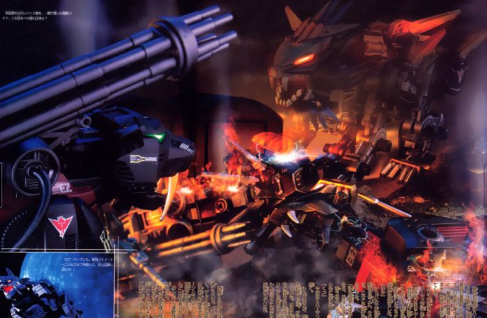 A direct hit was potentially just inches away, only, it was dodged. Something had ducked the Gatling's trajectory and leapt into the air. Immediately after, the escorts on either side exploded. The had been in a Dark Horn and Lightning Saix. Two mainstay Zoids of the Guylos Empire. In a single blow, they were almost completely destroyed.