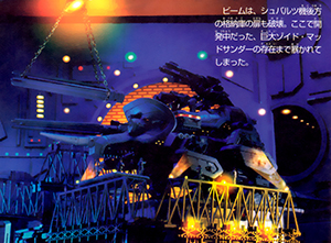 The beam also destroyed the hangar door behind Schwarz's machine. The existence of the giant Zoid, the Madthunder, which had been under development at the time, was also exposed.