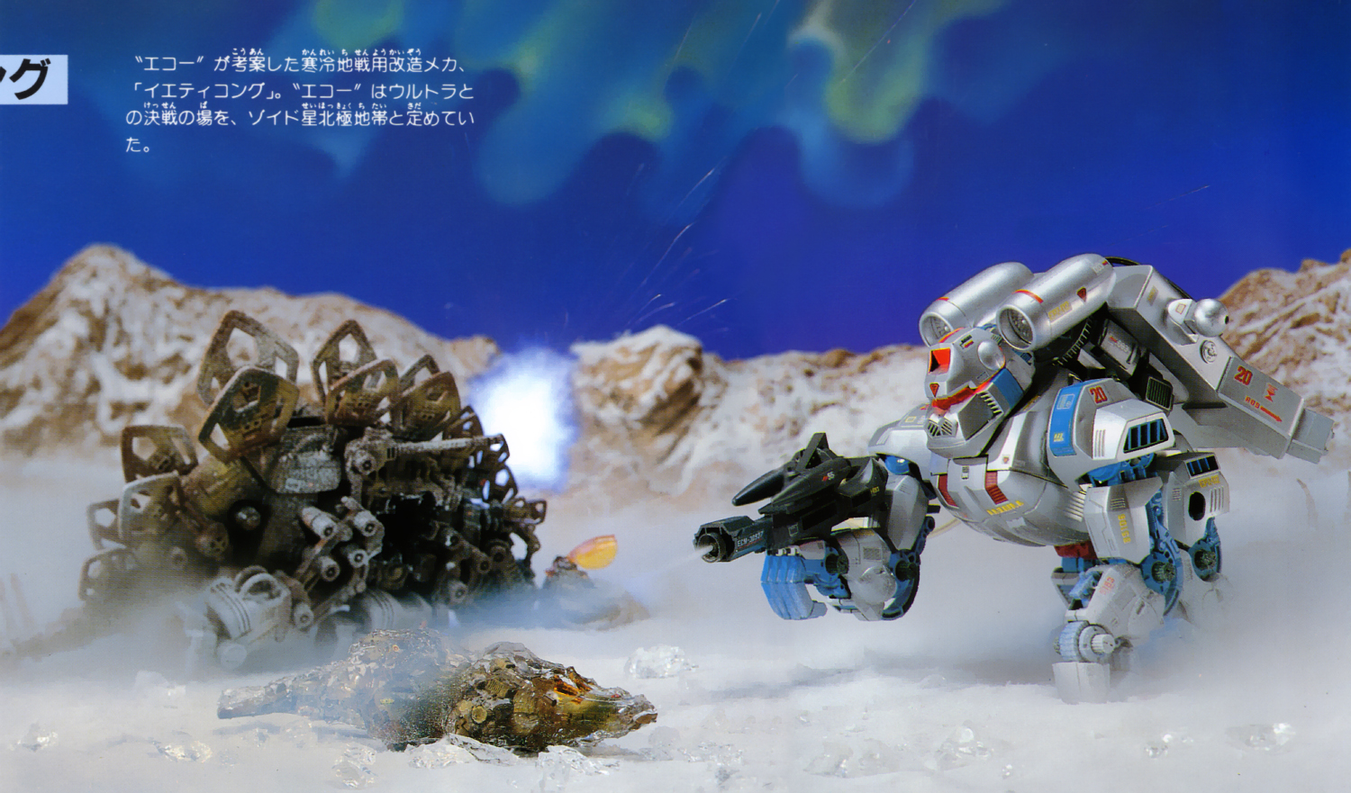 The Yeti Kong is a mecha modified for cold weather combat, invented by Echo. Echo had set the site of the final battle against the Ultra to be the polar regions of Planet Zoid.
