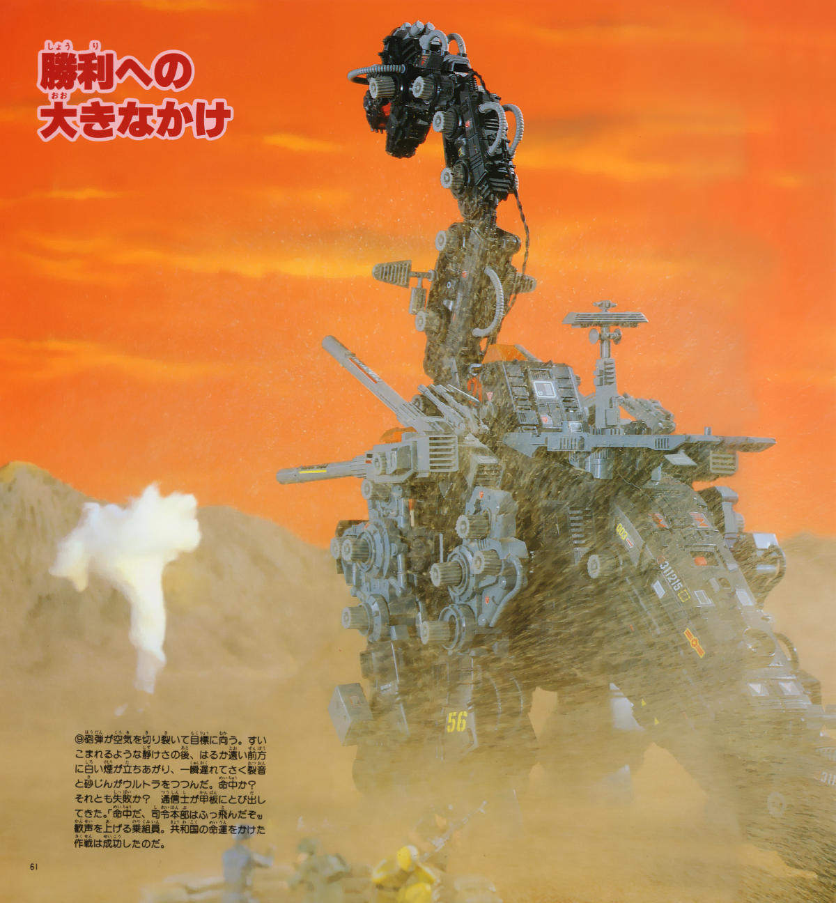An invisible narrow road stretched out before the Ultra Force, which continued to advance north. All of the Zoids of the Republic's landing force were protecting it with their lives. It was also the road that the remaining Imperial forces were trying to block with all their might. At the end of that road was the Command Headquarters, an important base from which operations were issued to the Imperial Expeditionary Forces that had invaded the Republic, and where Emperor Zenebas himself was in command.