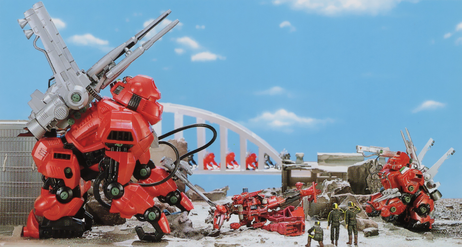 The night of fighting had ended, and the morning sun rose over the Burnham River. The border bridge finally belonged to the Imperial Army. Two Kongs gently laid Lt. Col. Frost's beloved Iguan on the riverbank. All Imperial Zoids crossing the bridge at the time halted their march, and the pilots stood in their cockpits.