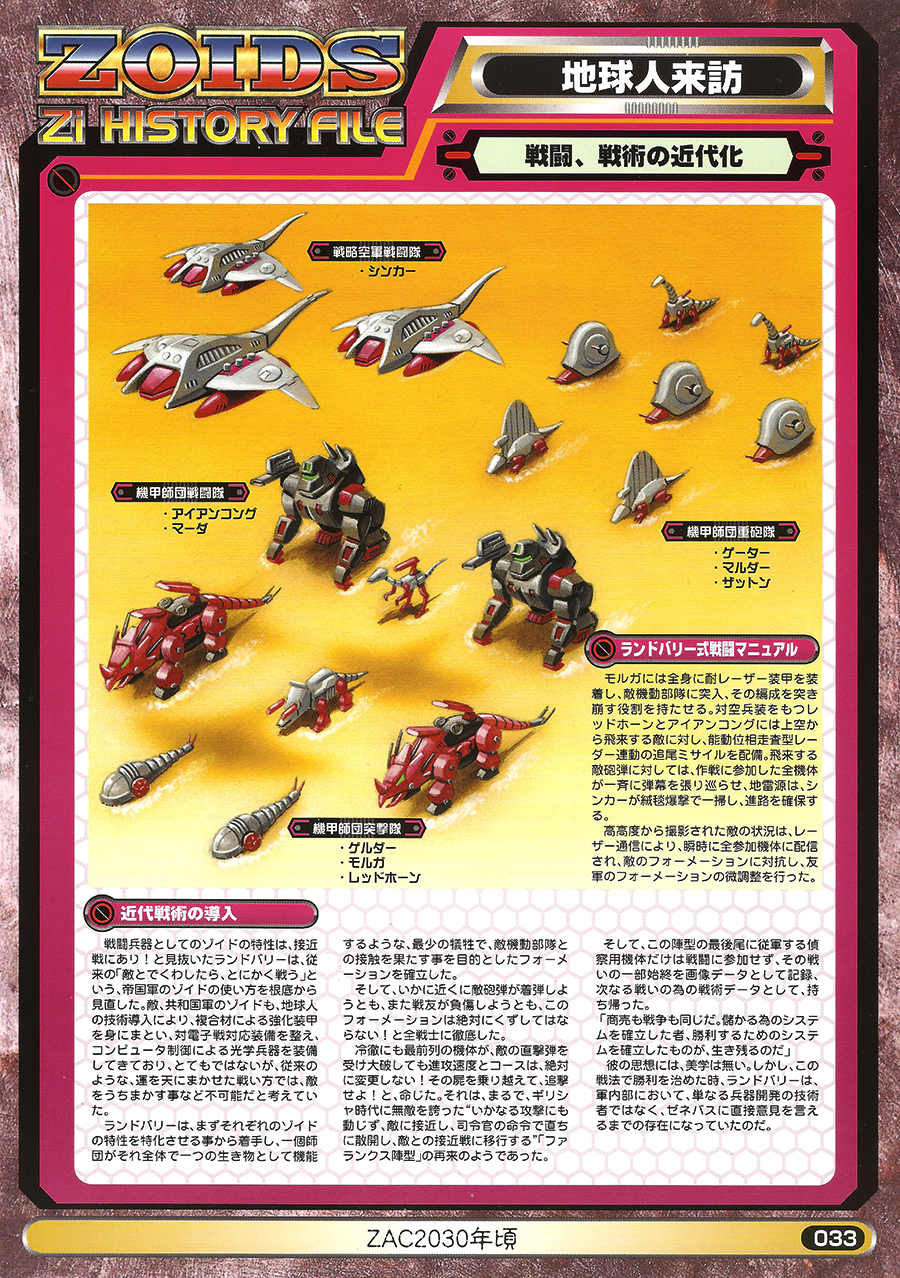 Landbury first embarked on ascertaining the characteristics of each Zoid, establishing the right formation for the right place, in which an entire division would function as a single organism, with the goal of making contact with the enemy's mobile forces with the fewest sacrifices.