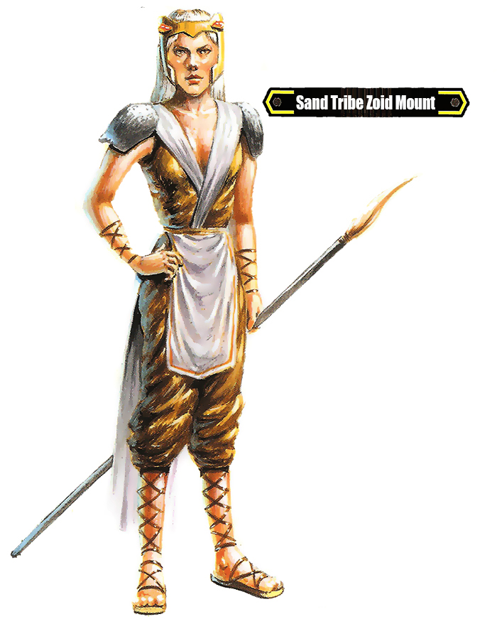 This is thought to be because the temperature in the desert rose at that time due to a change in the sun's thermal radiation activity, causing a serious shortage of domestic water to continue for many years, and because they absorbed too many other races at the same time. Afterwards, they continued their lives in small villages dotted around the desert. They created bases of life at oases, and domesticated reptile-type Zoids to make a living. They bred several species of reptile-type Zoids for transportation, construction work and combat and lived together with them, but they had little interaction with other tribes and continued to live in seclusion in the desert, so little is known about their actual state. They worship a sun deity, and for physical characteristics they have white hair and black eyes. Since the collapse of the old city-state, they have become exclusive and are shunned by the surrounding tribes. |