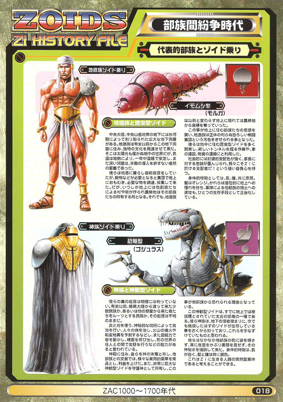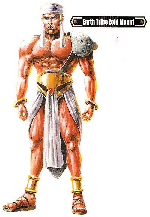 They lived in the depths of the earth and were self-sufficient, but when they needed grains and such they would proceed to the surface in groups to procure and collect the necessary items. However, before they knew it, villages and towns were created by other tribes on the surface, and farmlands became places owned by these tribes. Even so, the Earth Tribe appeared on the surface and stole food from the farmlands just the same as before. This earned them animosity from the tribes living on the surface, and the Earth Tribe became infamous as a dreadful combat group whose true nature was unknown. They bred many insect-type Zoids that lived underground, and used them for transporting materials, constructing houses and the work of digging new tunnels. Socially, they had strong shades of feudal rule, prized loyalty towards family heads, and had great pride, saying "We are the rulers upon Zi!" As physical characteristics, their skin and eyes are both red-brown. Their hair is orange. They have a latent yearning for the surface, and even justify attacks by armies on other tribes' territories as a means of survival. |