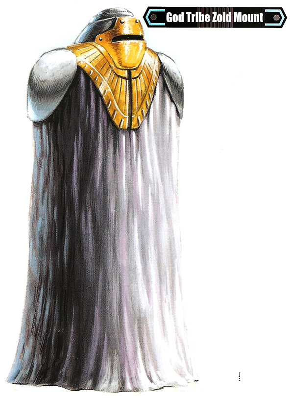 They conducted politics with mystical sorcery using fire and light, cured people's illnesses, and predicted volcanic eruptions and natural disasters, and are said to have had powers such as moving rocks with psychokinesis, summoning spirits, and holding conversations with residents of the world of the dead. They lived in temples, called themselves descendants of the gods, and raised profits in trade with other tribes by selling a variety of practical medicinal herbs. They also possessed extremely large divine beast-type Zoids as guardian deities, and this became one reason they were feared by other tribes. These divine beast-type Zoids were an ancient species of dinosaur thought to already be extinct on the surface. It is believed that the God Tribe had known since long ago that these supposedly-extinct Zoids had survived in underground lava reservoirs, and had tamed them. They rarely show themselves in front of other tribes, always wearing masks and never showing their faces, to emphasise their mystique. As for their physical characteristics, their skin is white, and their hair and eyes are both silver. This can be considered a mutant form of the humans living on Zi. |