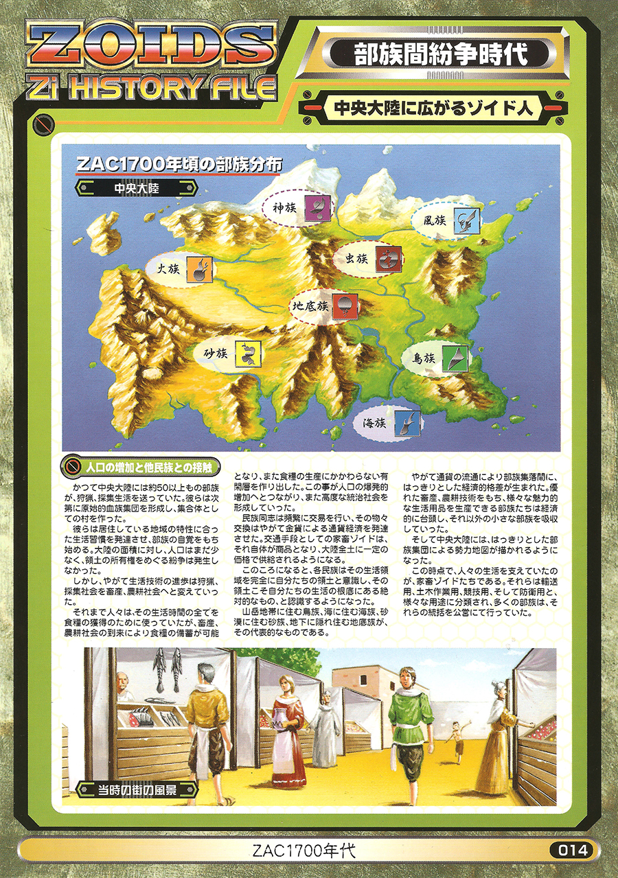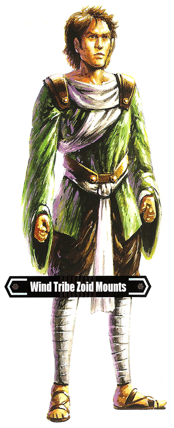 They are a peaceful tribe who use trees and their fruits as living provisions, prize harmony with nature, and worship nature deities said to dwell in trees. They create dwellings atop huge trees, and honour family systems. They developed technology related to wood processing, created various living necessities using resin as an adhesive, and engaged in trade with other tribes. They have domesticated bird-type Zoids living in the primeval forests since ancient times, using them for transportation, construction and combat. In particular, soldiers who performed aerial battles upon bird-type Zoids were worshipped by the people and given the title of "Warrior", and their lineage was inherited only by blood relatives. In the oldest surviving "Zoid rearing" literature, there is a description of how Zoid trainers tamed Zoids by sleeping and waking up together with them, and one can feel their enthusiasm to tame Zoids at that time. As for their physical characteristics, they have black or deep grey eyes and blond hair. In addition, there are surviving accounts saying that at the time considered to be the beginning of civilisation, the primeval forest regions were assailed by changes in climate, and that every time the temperature dropped they would migrate to a different primeval forest region; this is thought to have been performed with the arrival of each season. |