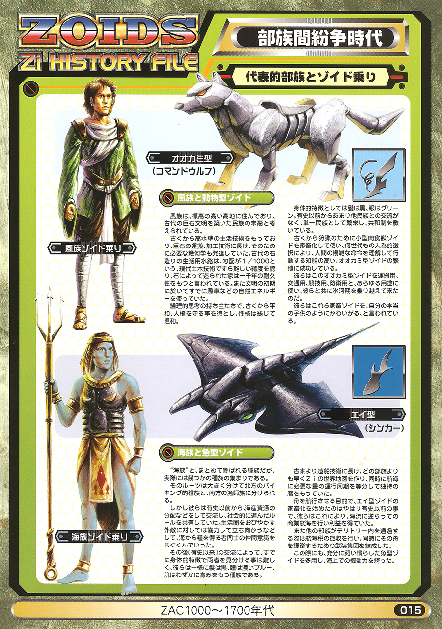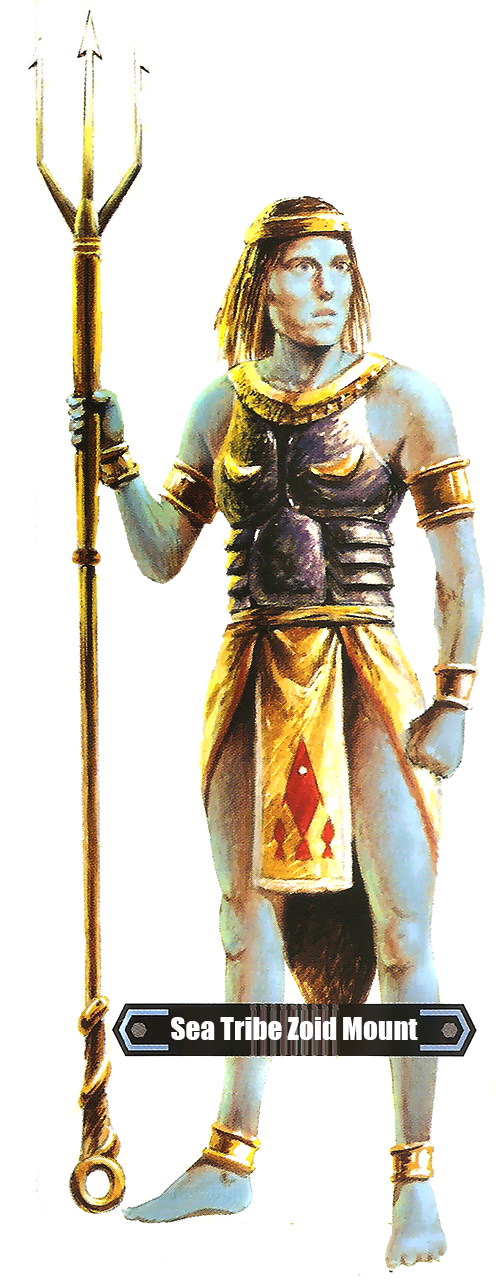 Their roots can be broadly divided into a northern Viking-like race and a southern fishing tribe. However, they have had interactions since before recorded history such as dividing marine resources, and shared socially-advanced rules. They cooperated to oppose foreign enemies that threatened their spheres of life, and fostered a sense of companionship between people who gained food from the sea. Due to later intermingling (after the dawn of history), it is already difficult to distinguish the two based on physical characteristics; as a race they uniformly have black hair, deep blue eyes, and a slight blue tint to their skin. They have excelled in shipbuilding technology since time immemorial, creating a world map of Zi sooner than any other tribe, and at the same time they possessed a unique calendar that evenly divided the revolution periods of stars necessary for sea voyages. As one might expect, it was before recorded history that they began the domestication of ray-type Zoids with the goal of having them tow ships, and this let them engage in commercial voyages against the ocean currents and gain profits. They also levied a sailing tax when other tribes passed through their territory, and at the same time formed armed groups to guard these ships. Here too they made frequent use of thoroughly tamed fish-type Zoids, and boasted great mobility on the sea. |