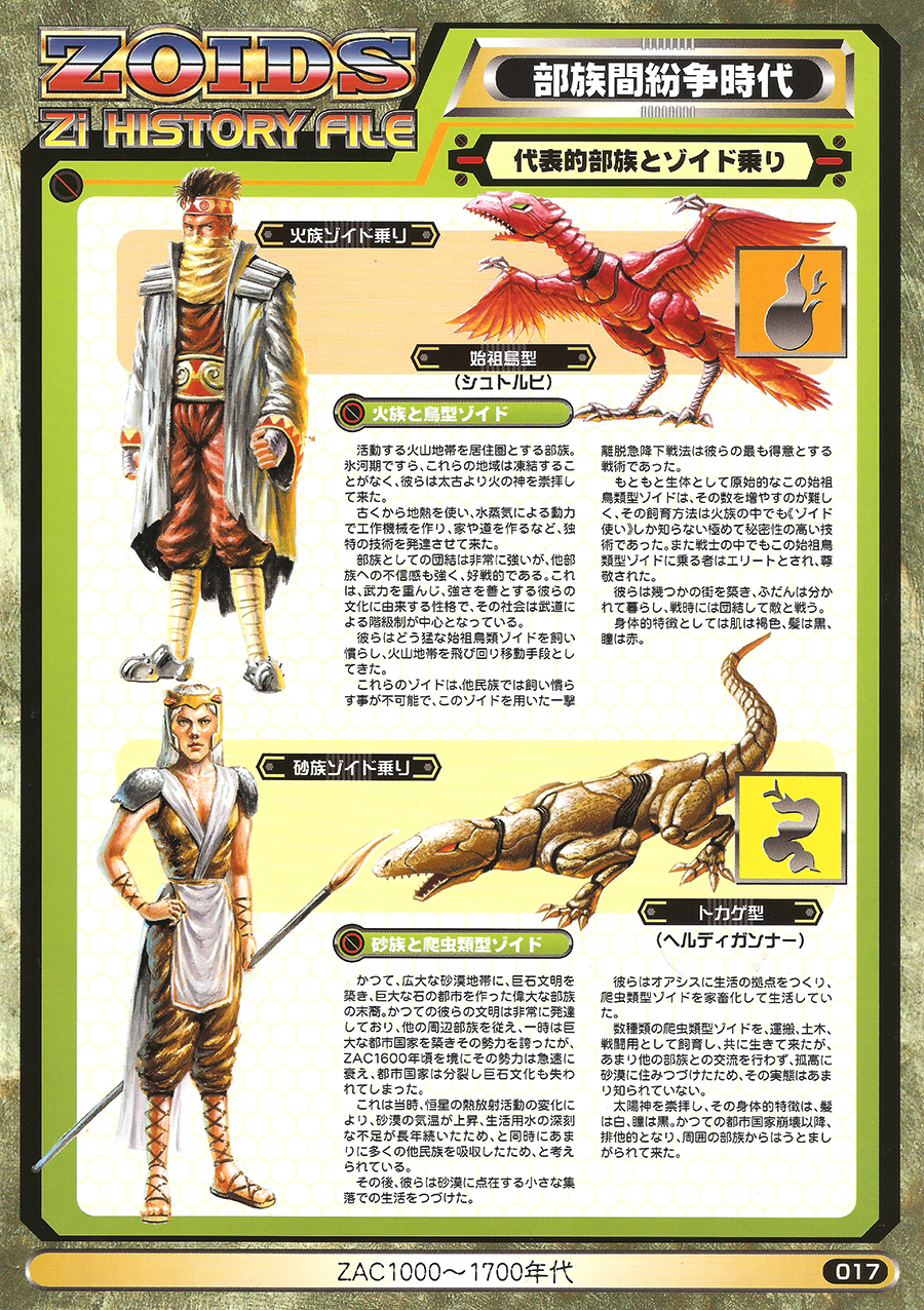 They have used geothermal energy since antiquity, and developed unique technology such as creating machine tools using steam power to build houses and roads. Their unity as a tribe is extremely strong, but they are also warlike and have a powerful distrust of other tribes. This personality is derived from their culture, which honours military power and considers strength a virtue, and their society is centred on a caste system based on martial arts. They have domesticated ferocious archaeopterygiform Zoids and use them as a means of travel, flying around the volcanic zones. It was impossible for other races to tame these Zoids, and hit-and-run diving tactics using these Zoids were the tribe's specialty strategy. These archaeopterygiform-type Zoids were by nature primitive as organisms, so increasing their numbers was difficult, and the methods for rearing them were an extremely high-secrecy art even among the Fire Tribe, known only to "Zoid tamers". In addition, those who rode these archaeopterygiform-type Zoids were considered elites and honoured, even among warriors. They have constructed a number of towns and usually live separately, but in times of war they unite to fight enemies. As physical characteristics, they have brown skin, black hair and red eyes. |