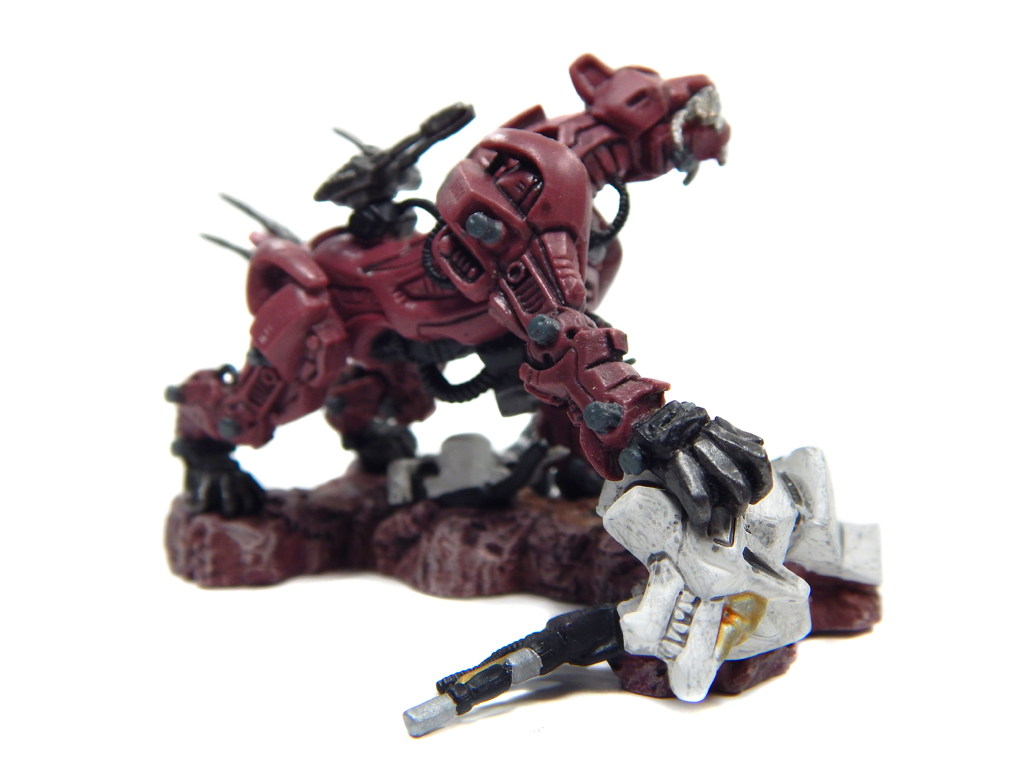 One down side to the Saber Tiger in particular is that these soft rubbery PVC figs can warp over time, and the Saber having so many long thin parts makes this really noticeable. The ground I think I'd also prefer to be more earthy tones, as the red doesn't quite sell it to me when it's so similar to the Zoid's color. To be fair though, that's not the part you're gonna be focusing on. The dismembered leg that the tiger stands over is also a neat addition because, again, the Wolf is clearly downed already. They didn't need to add the extra detail, but they did, and I respect the hell out of it.