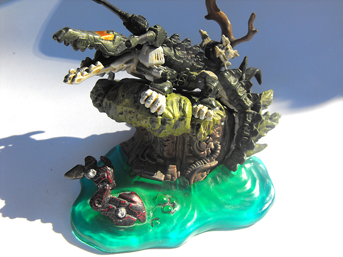 Barigator is the stunning art statue that made me so determined to collect this series. The colors of the water around this figure is vibrant blue-green and the detailing is excellent. I can't help but adore the little Storch in the tree, as well. While 'scenic' Zoids like this aren't to scale, I'm so happy that they decided to abandone overly-stringent rules in favor of building an environment that really does feel natural. The Helcat leg in the water does an excellent job of highlighting that gators aren't to be underestimated!